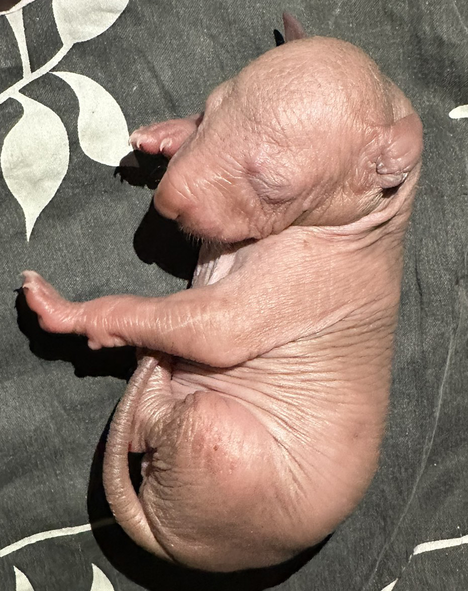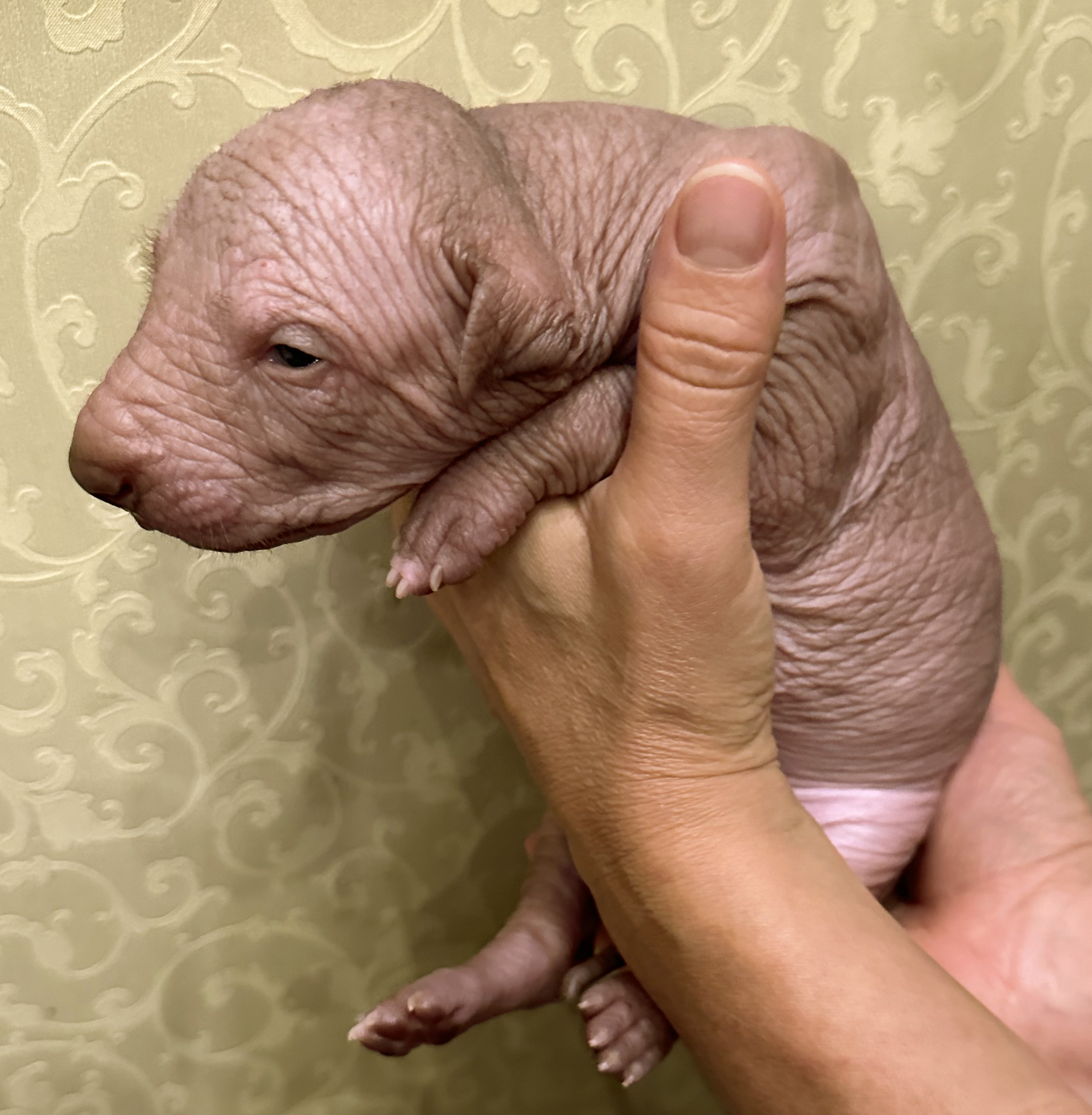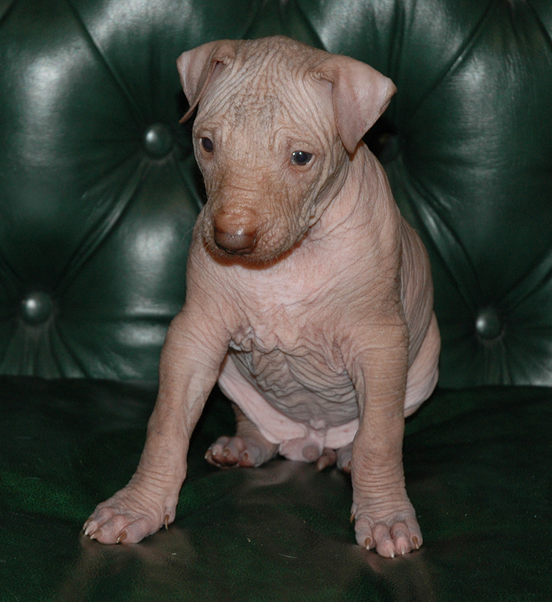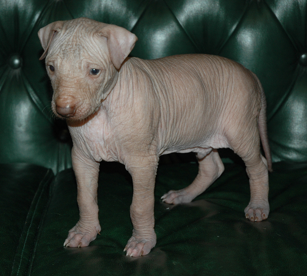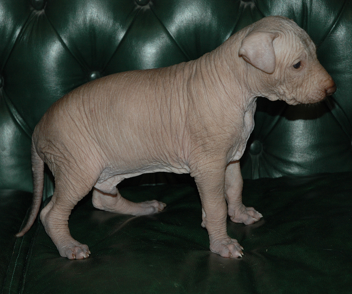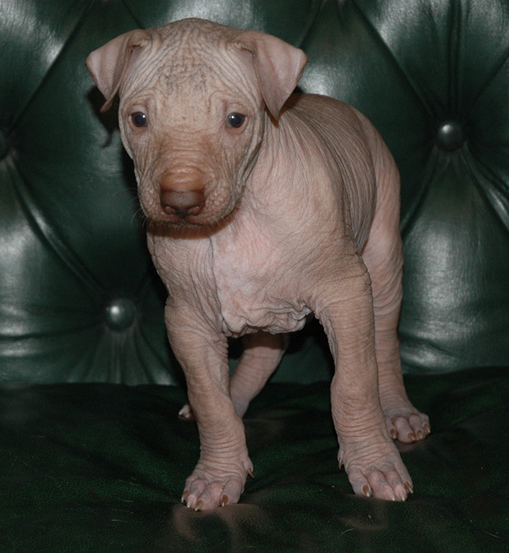 При народженні 480 г, справді голий, великий, сильний, спокійний пес, світла бронза, буде схожий на батька.