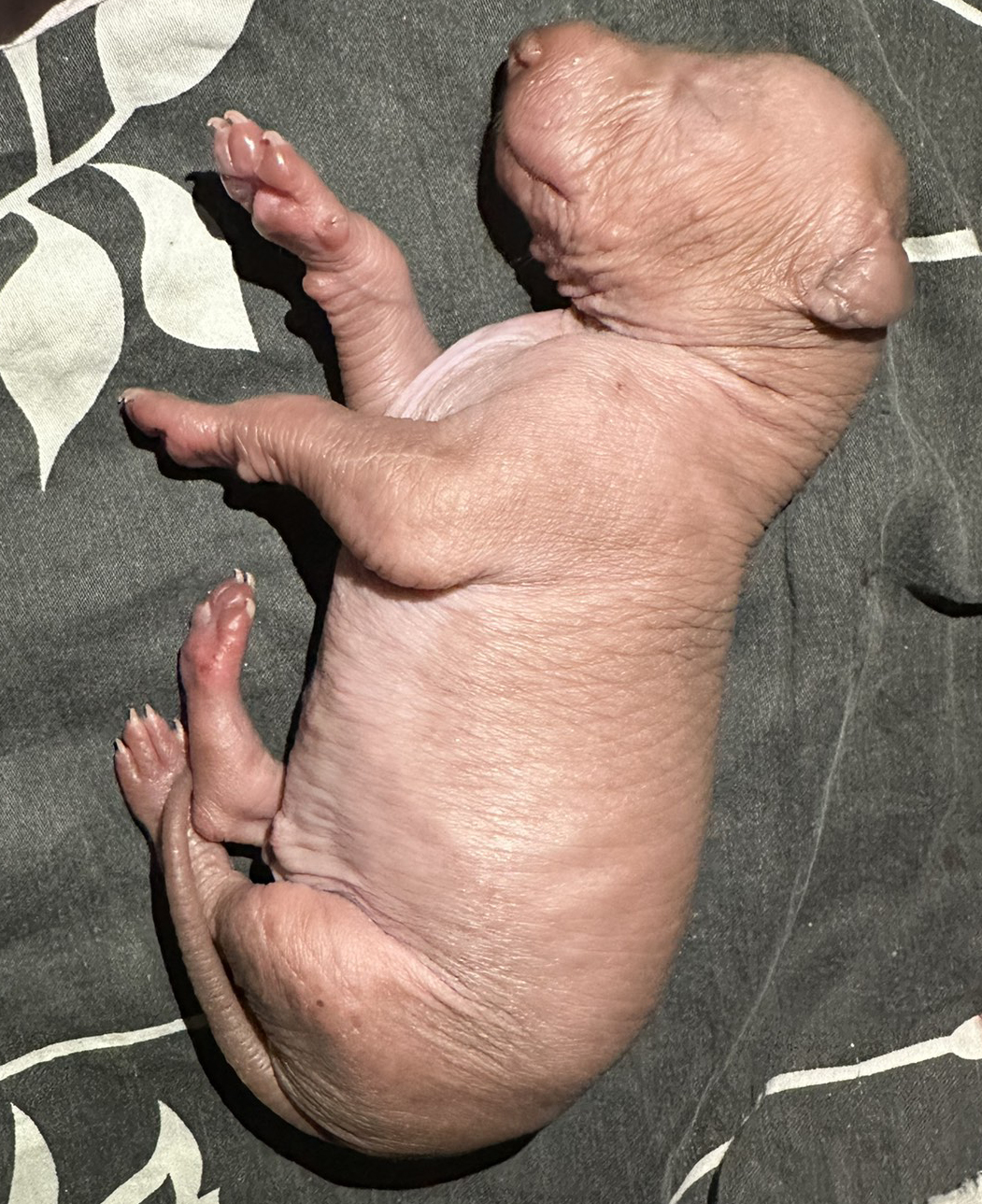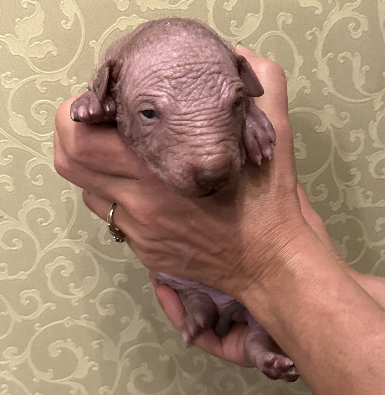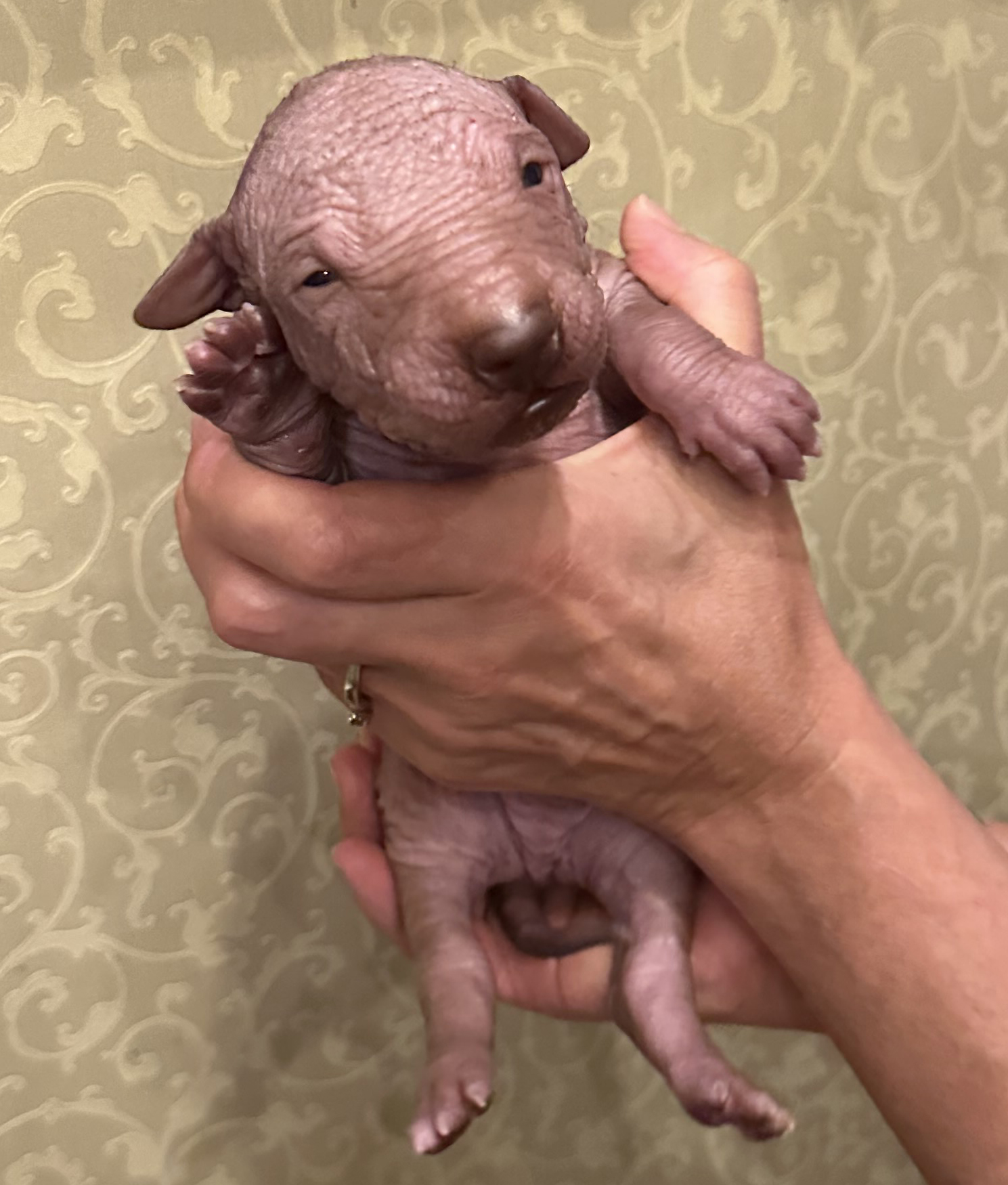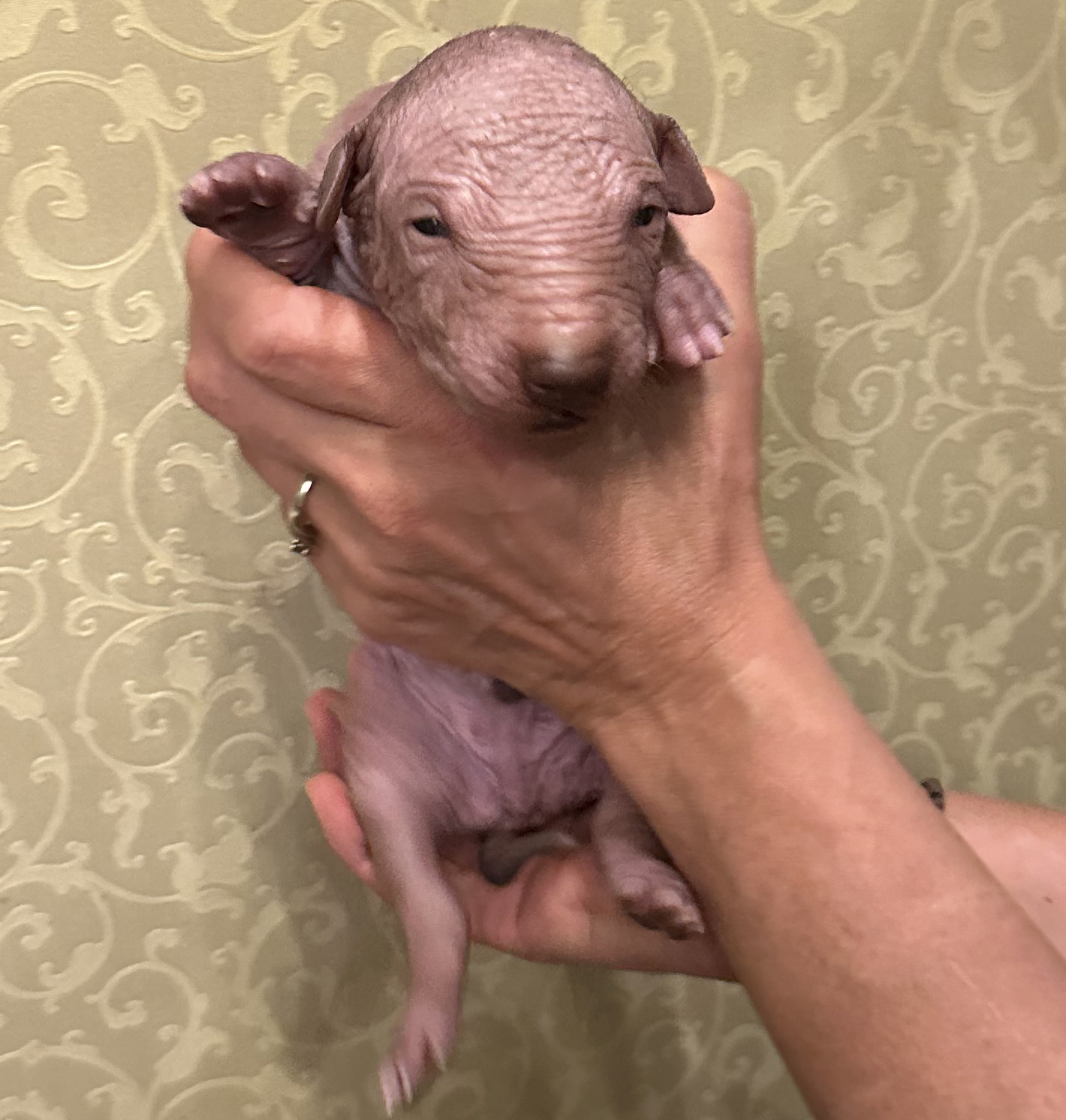 При народженні 480 г, справді голий, великий, сильний, спокійний пес, світла бронза, буде схожий на батька.