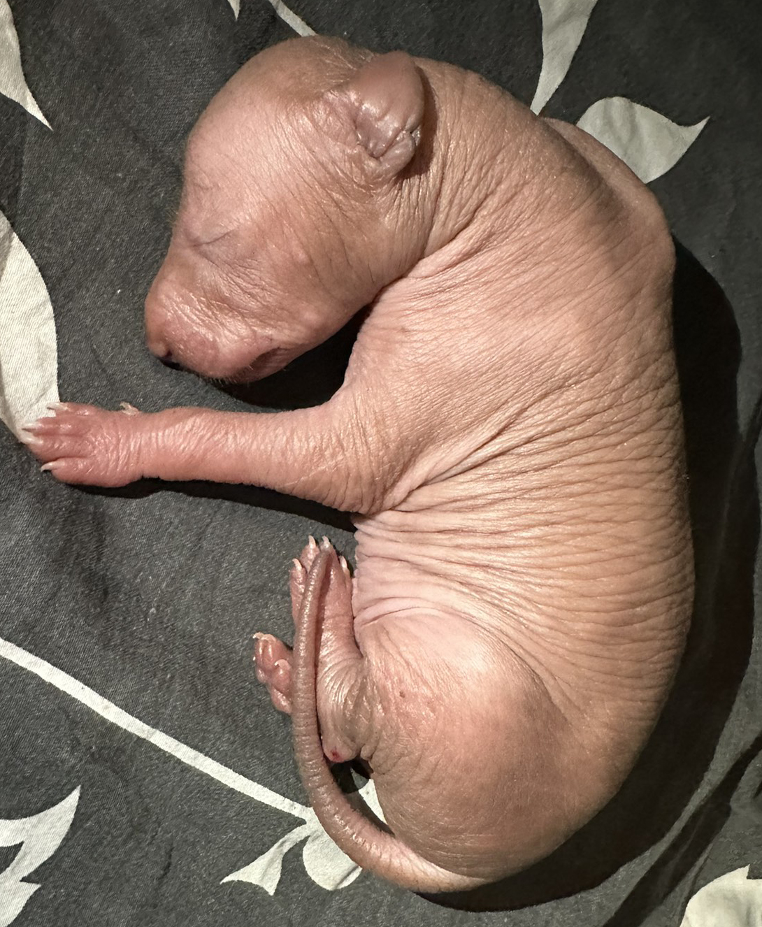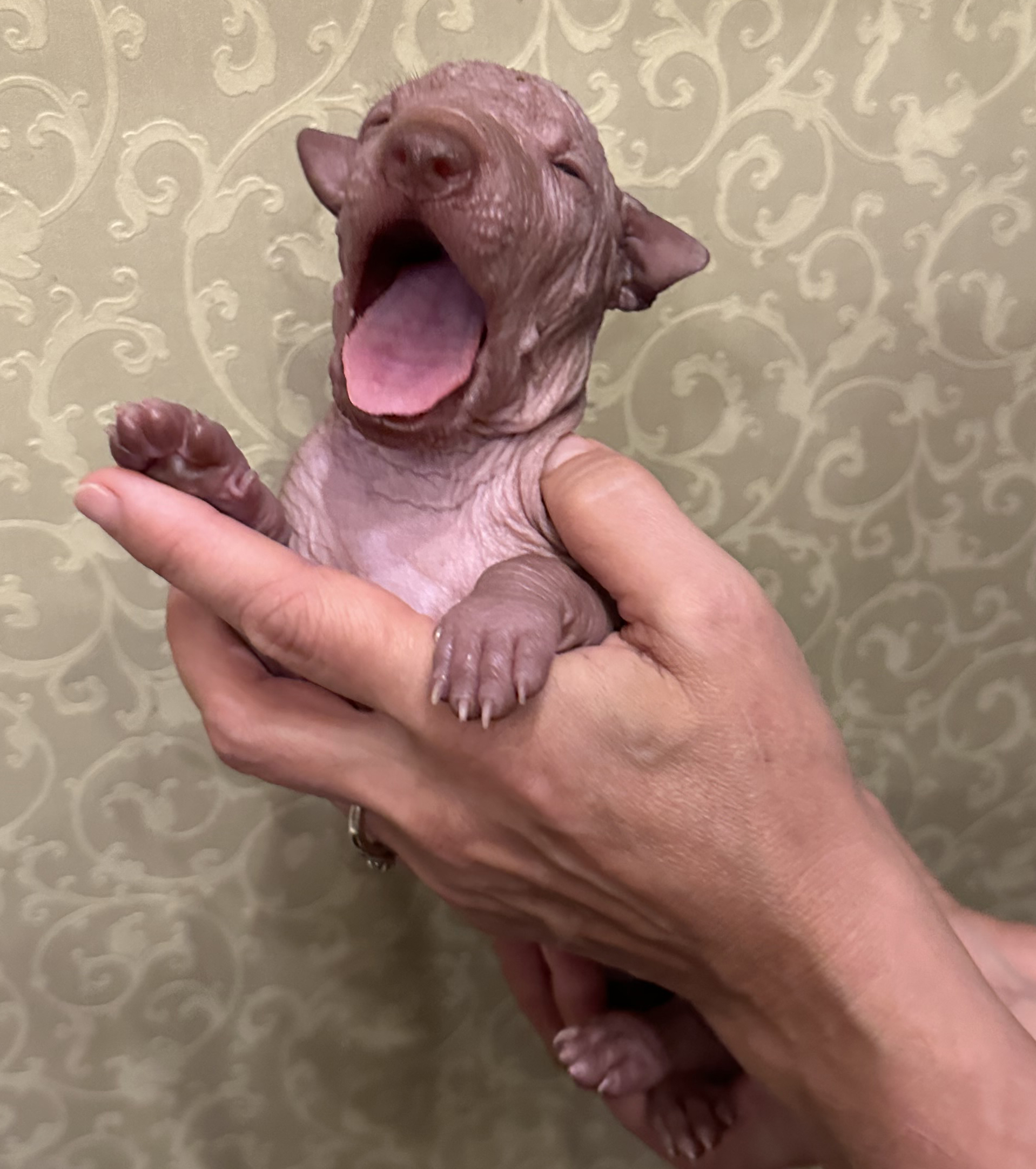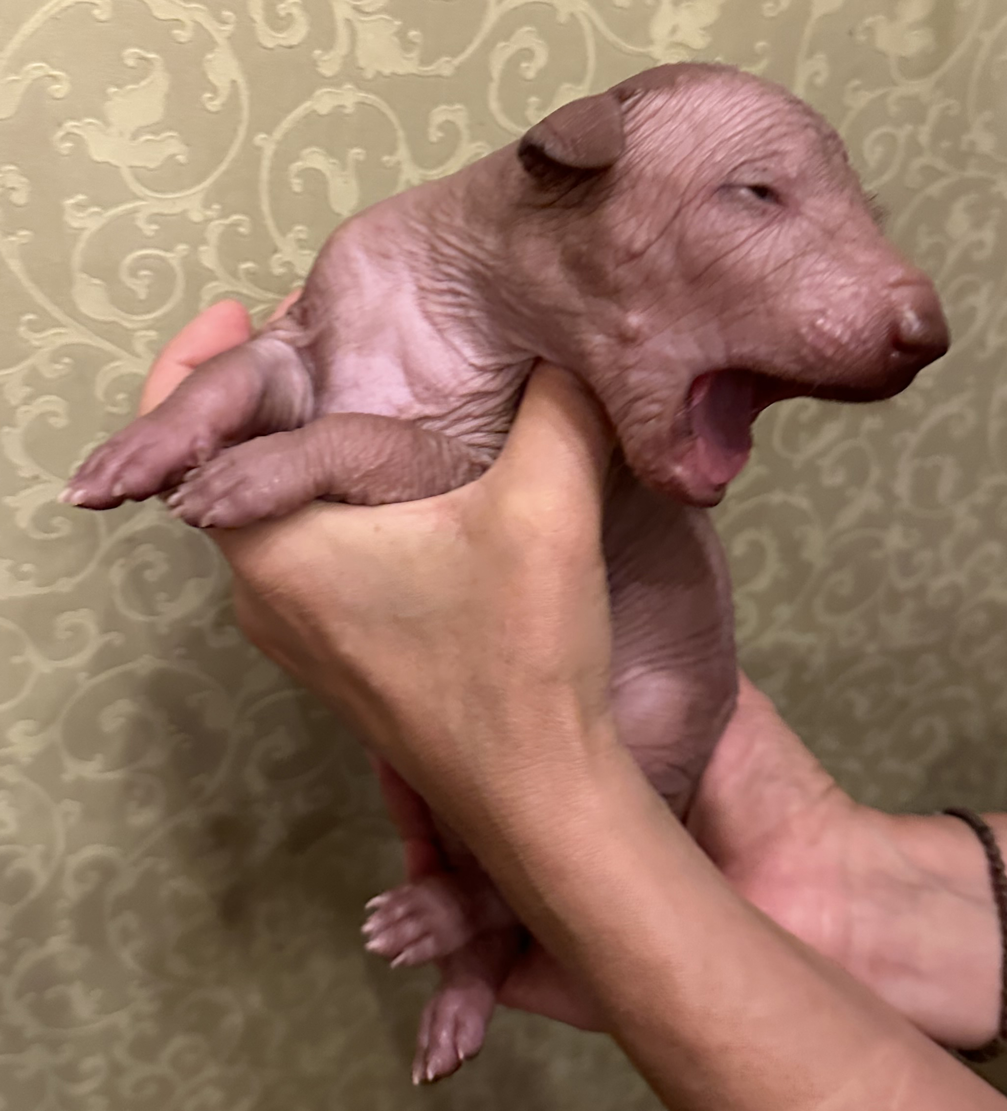 При народженні 465 г, насправді голий, великий, сильний, спокійний пес, світла бронза, буде схожий на батька.