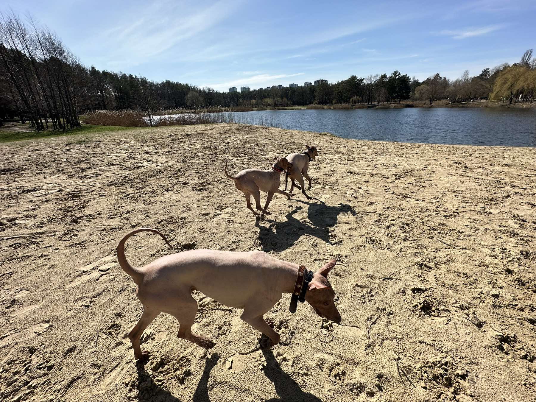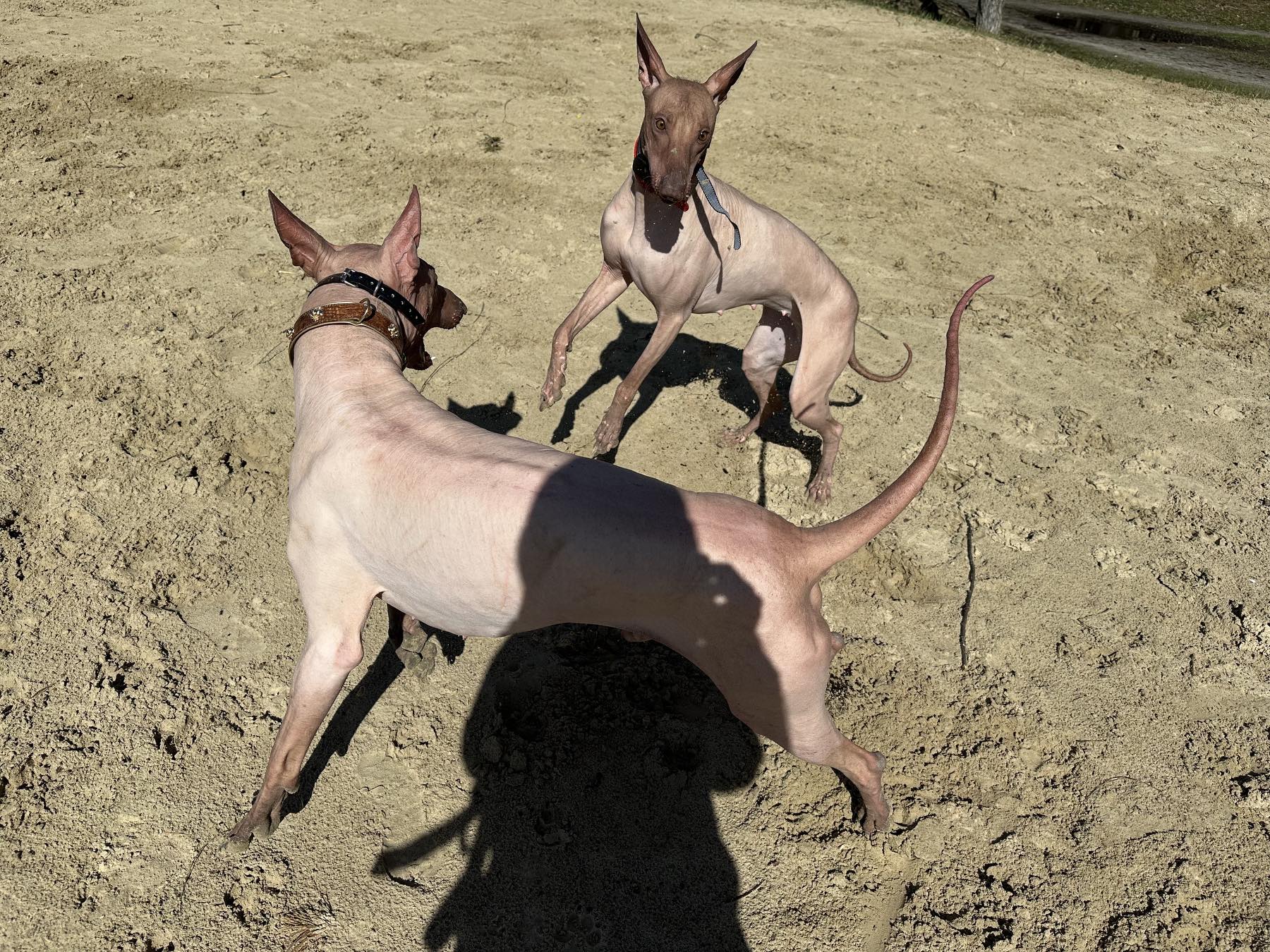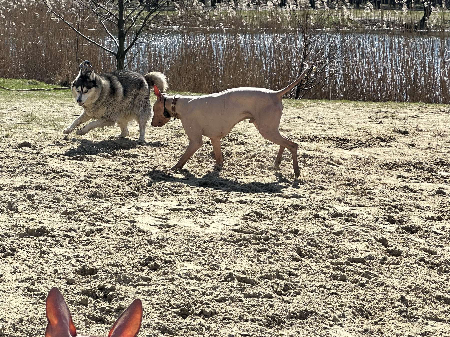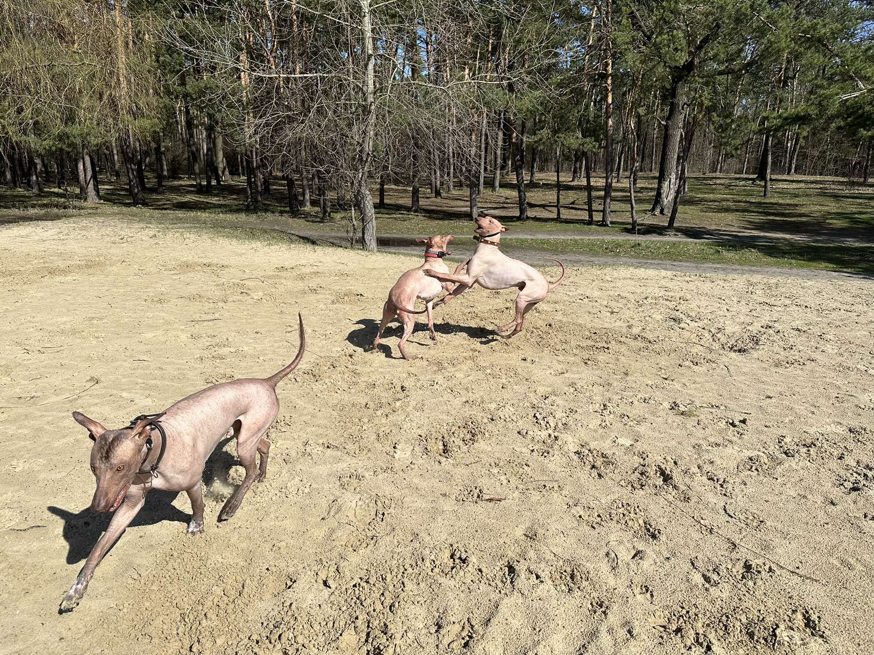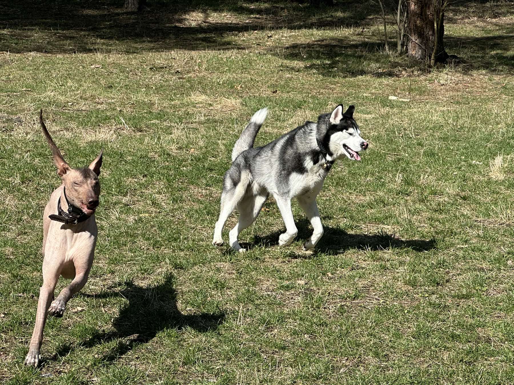 Зима 2024 року була досить сонячна і собаки придбали смішну зимову засмагу, як туристи гірськолижних курортів. Голови, ноги та хвости стали червоно-коричневі, а корпус біло-рожевий. Коли ми їх роздягли весною, це спочатку було дуже помітно і дуже смішно, але вони швидко засмагли під весняним сонцем.